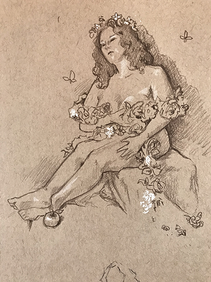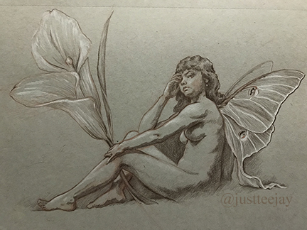 Then he spent the rest of the session working from another reference that I mistakenly thought he said that he hadn’t sent us. So I didn’t look for it. Instead I watched him work on the drawing. Then, wanting to do some figurative work I went and found a book that I had at the house with some vintage nudes and drew a fairy based on one of the photos.