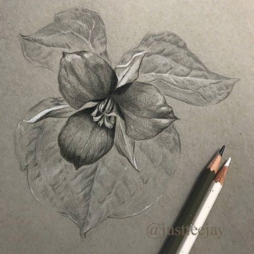 So feeling inspired by working in black and grey (and white) but still despising charcoal…. I decided to make some work on grey paper with more friendly media. The reference photo was taken by my sister Sarah. Trillium are my favorite flowers. I have some of these red ones in my back yard…. but it was easier to use Sarah’s photo.