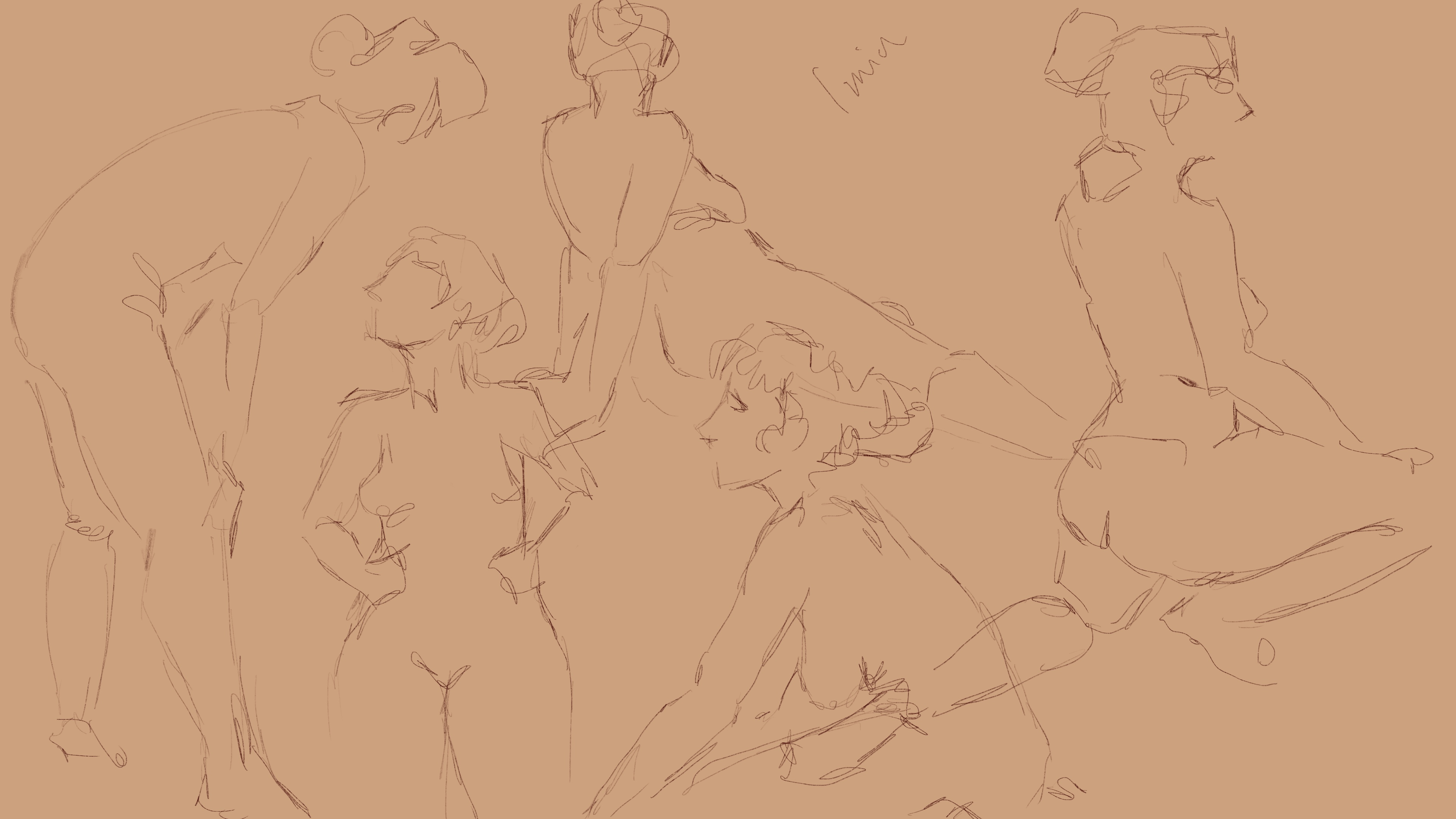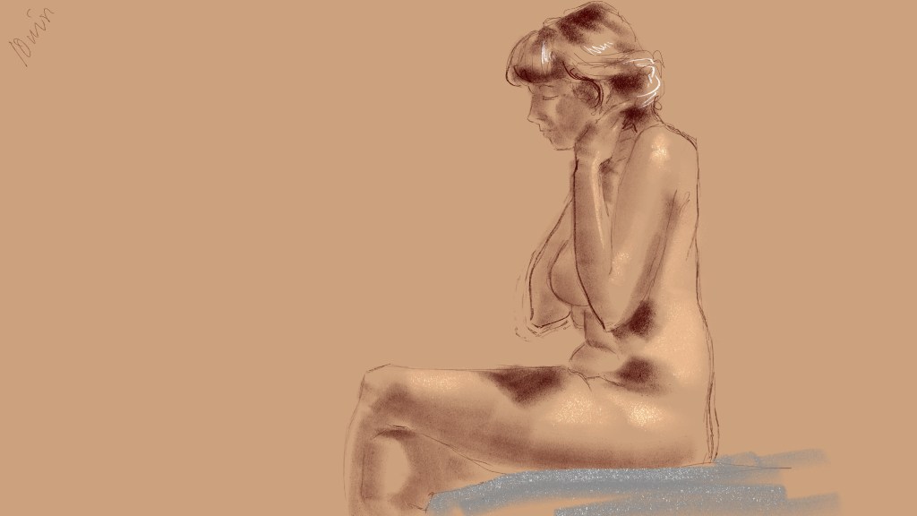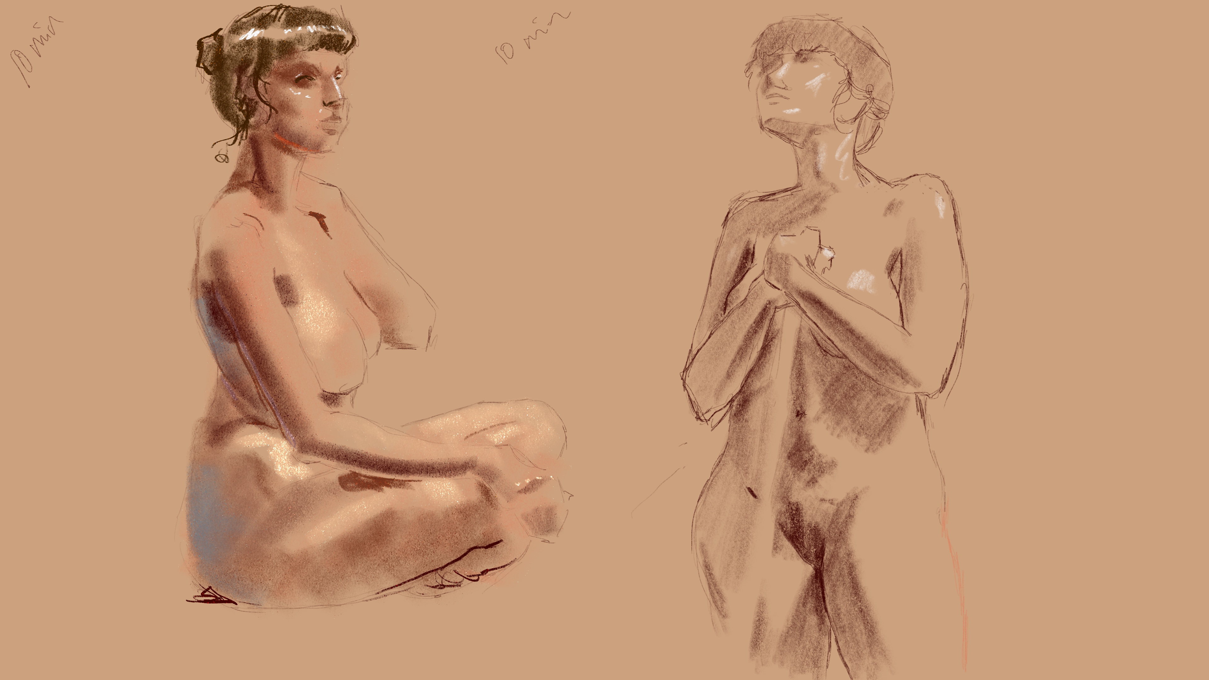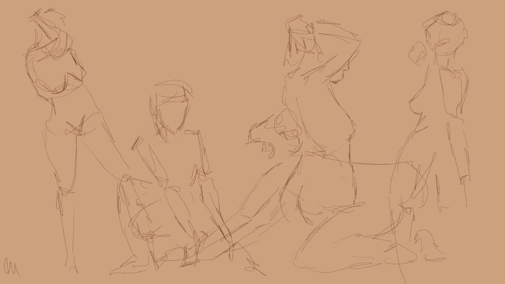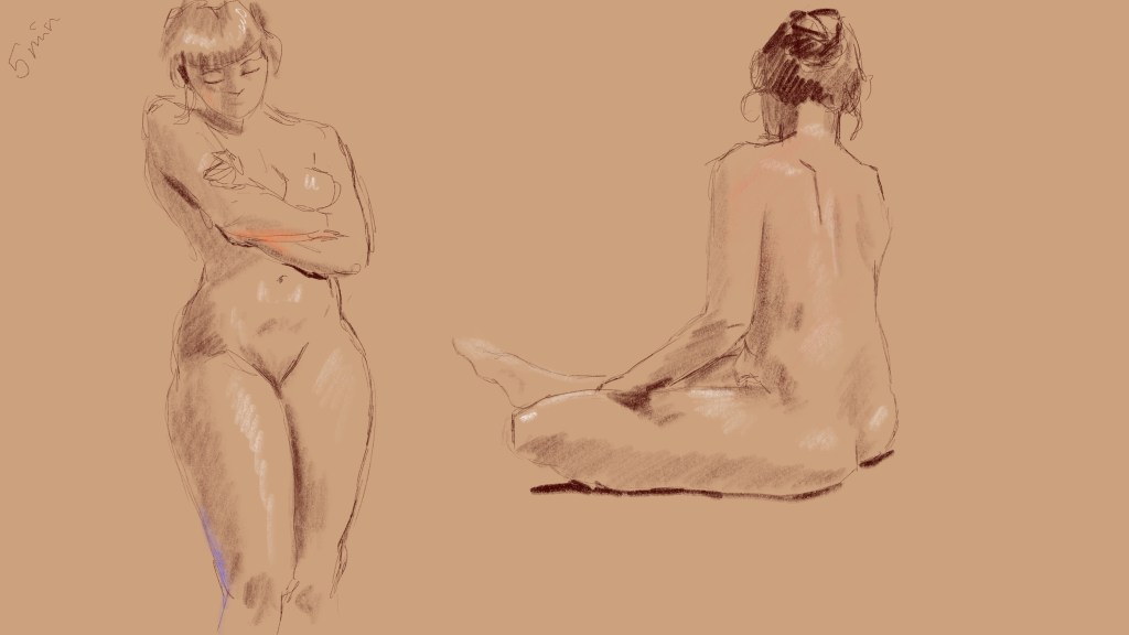 20 minutes – last post of the night and I never feel like I am working efficiently on the last one.35 minutes. Nia said on her Instagram today that she forgot to put a sheet down and got mild rug burn from this pose. 20 minutes. in going through the video I feel like I lost her nose at some point in the process… it was there and then it wasn’t. oops. 15 minutes10 minutes10 minutes each5 minutes each. one of the other artists remarked that they think 5 minutes is the sweet spot. Gestural and expressive without time to overwork. 1 minute poses30 second warm ups.