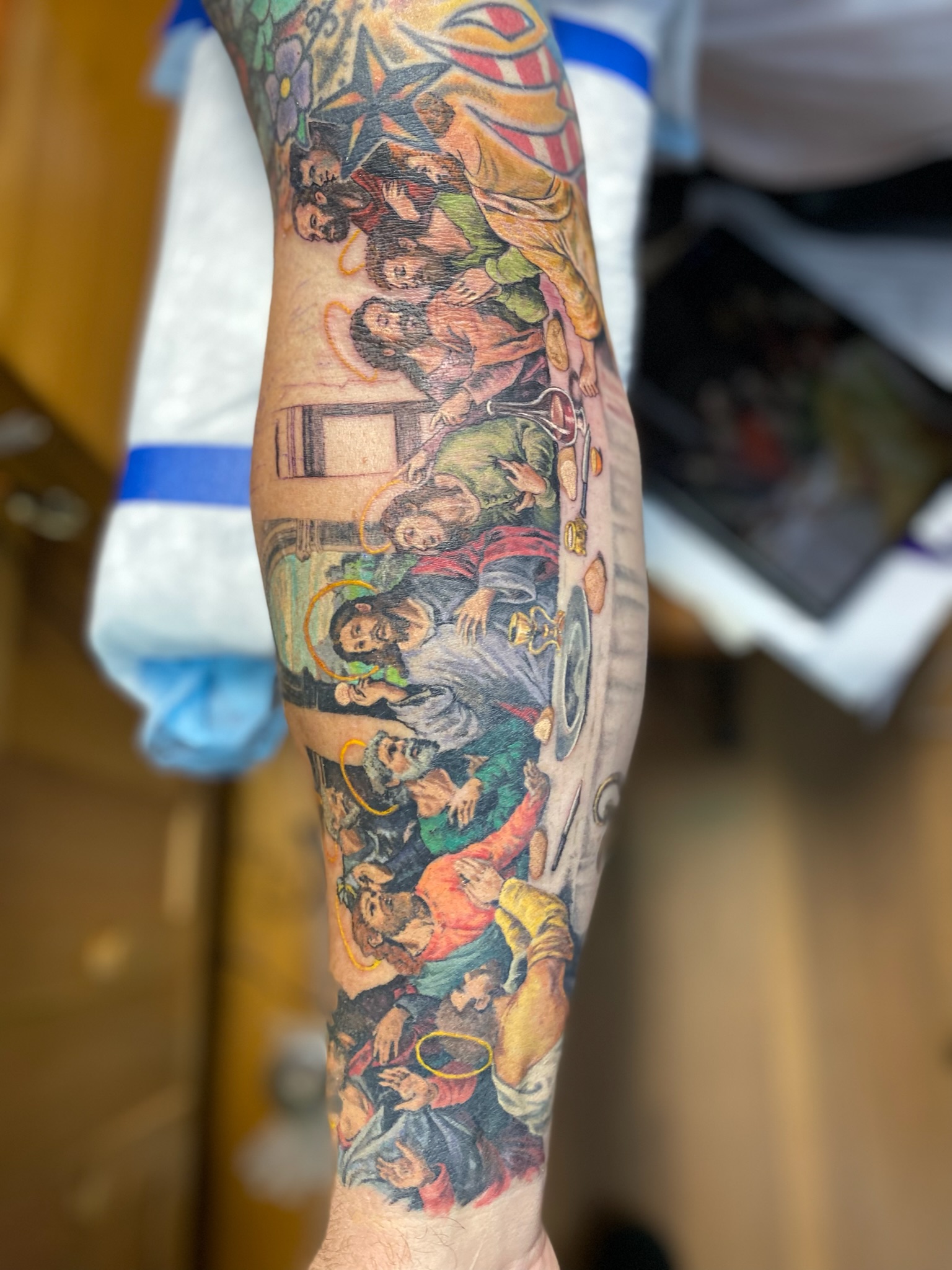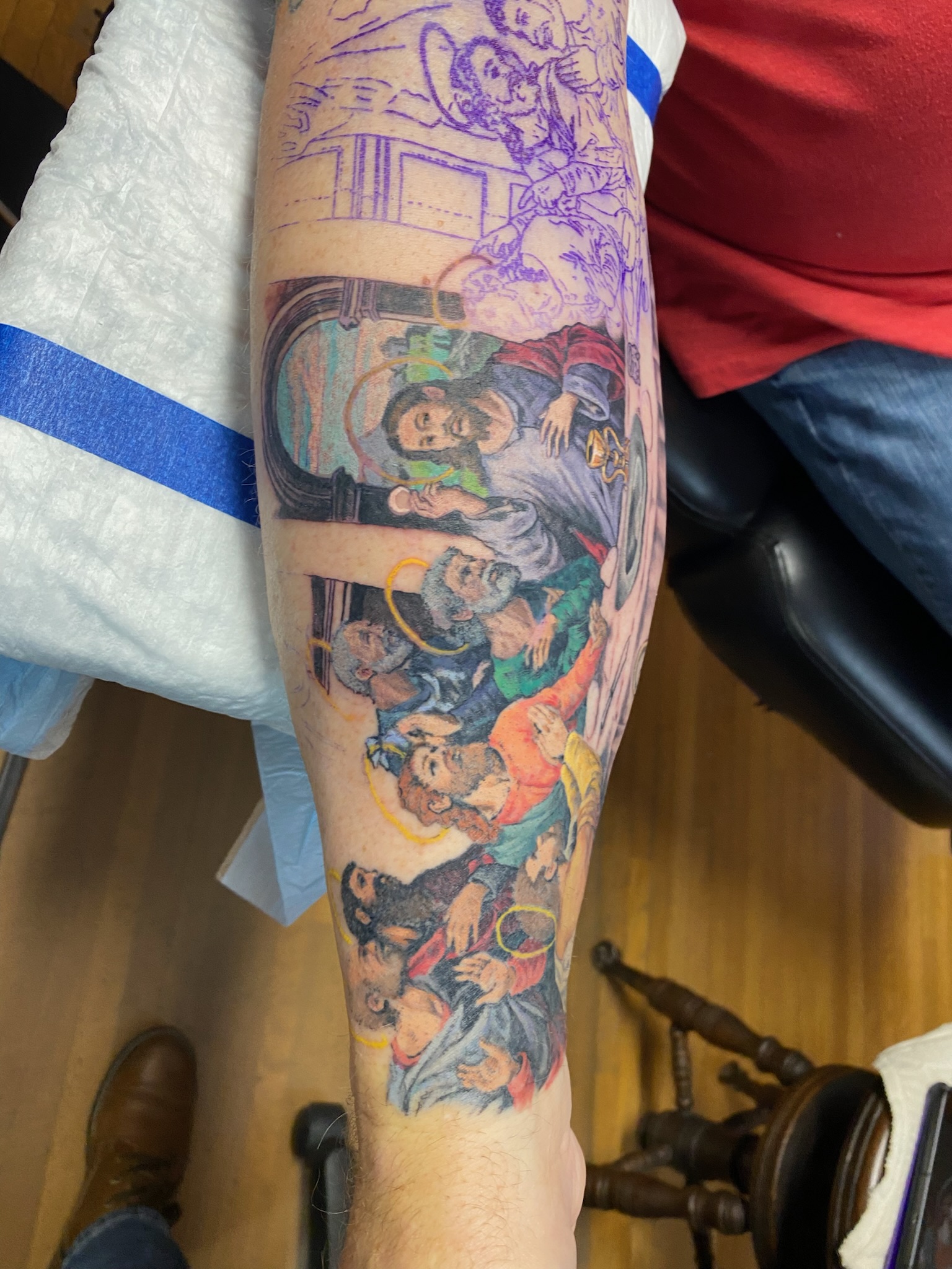 Last year he decided to start bringing his collection down further on his arms (prior to that he had kept everything easily concealable). He brought the idea of tattooing the last supper on his lower arm. A super challenging piece for both of us.