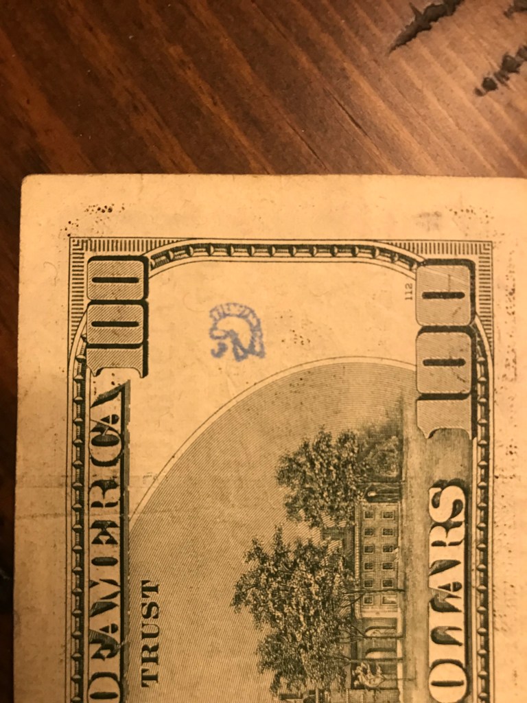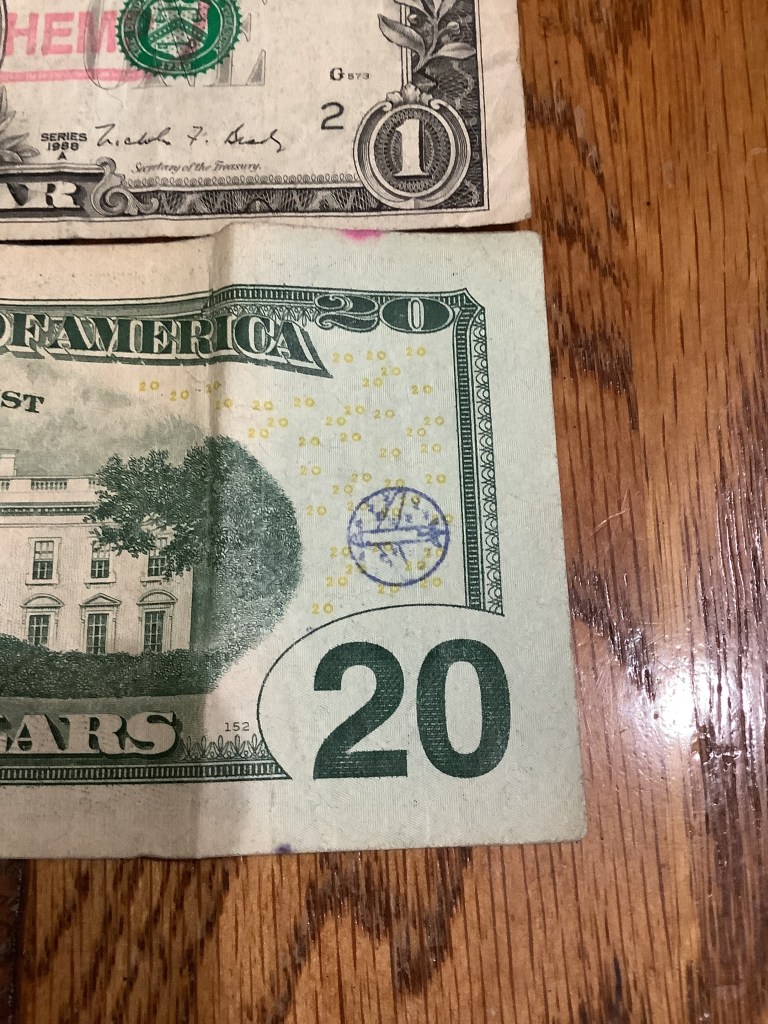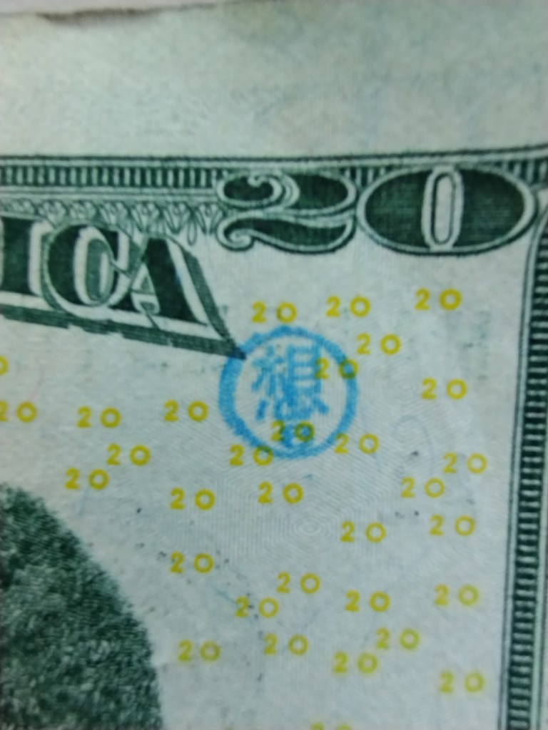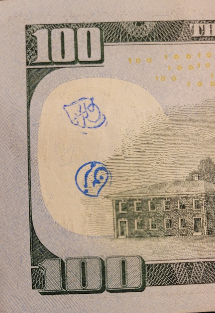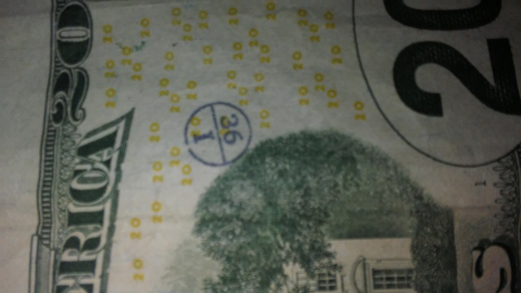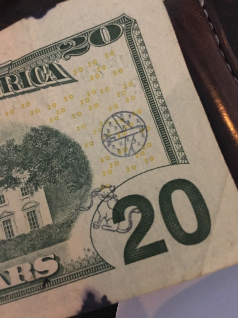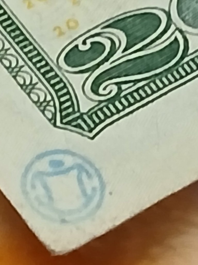 Hello! I was surfing the web for any insight for the stamps on money and found a blog of yours from 2012. Since I was a little kid I was always fascinated by these strange markings some bills had, but nobody let me keep them. Now that Im older, I can at least keep a record of them. I only got to keep the blue dog stamp because I begged so hard for it. Im not sure who stamped it or where it was stamped, but it belonged to my great grandfather.