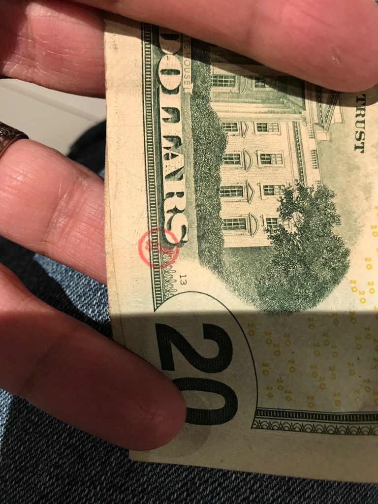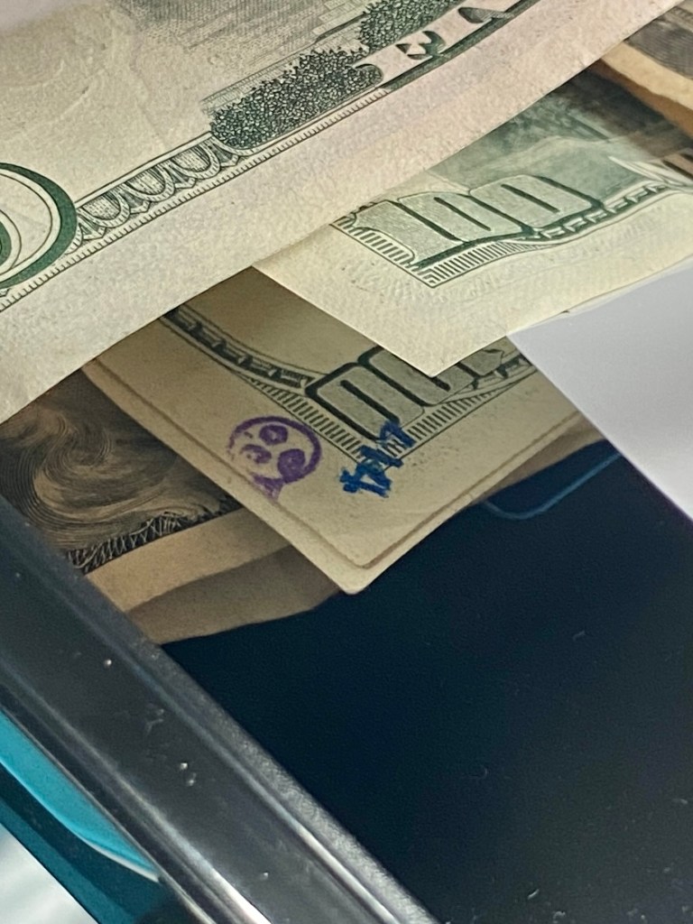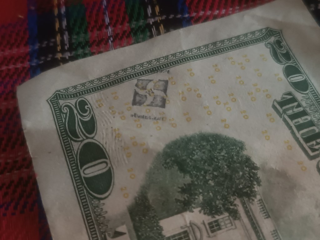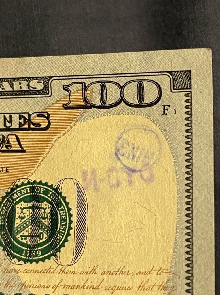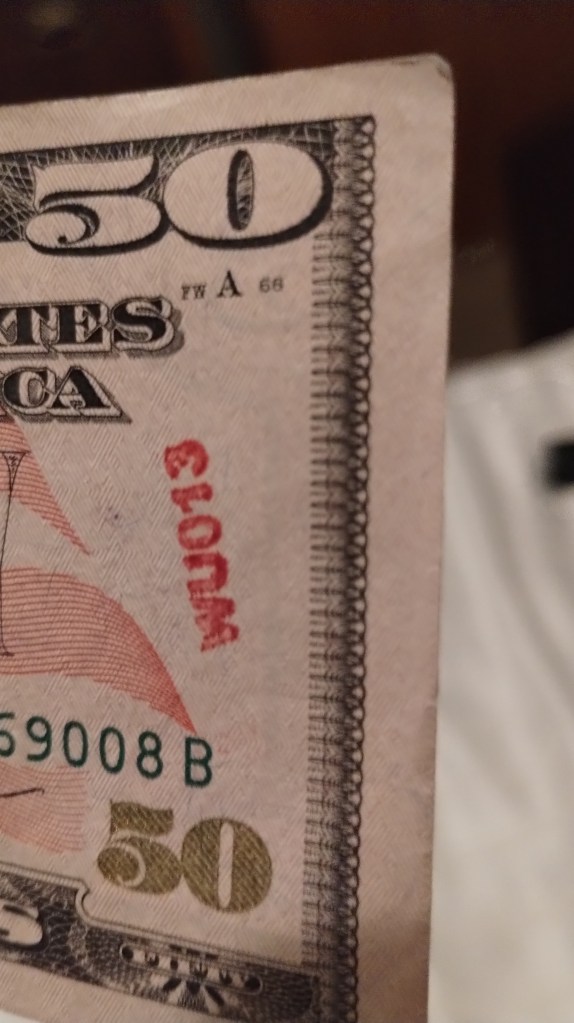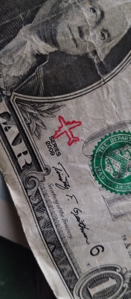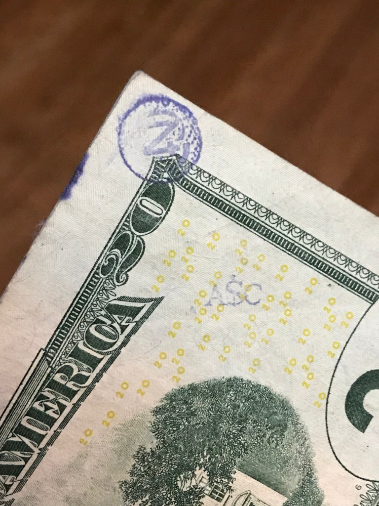 Hello! I was surfing the web for any insight for the stamps on money and found a blog of yours from 2012. Since I was a little kid I was always fascinated by these strange markings some bills had, but nobody let me keep them. Now that Im older, I can at least keep a record of them. I only got to keep the blue dog stamp because I begged so hard for it. Im not sure who stamped it or where it was stamped, but it belonged to my great grandfather.