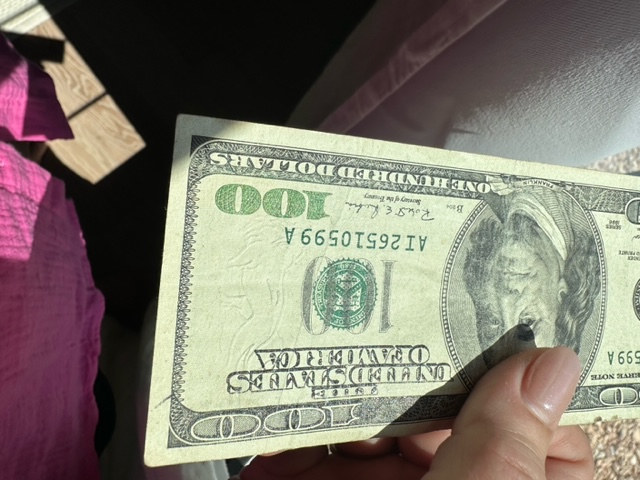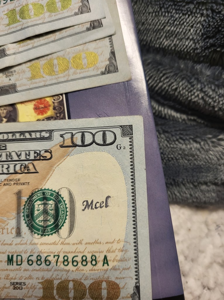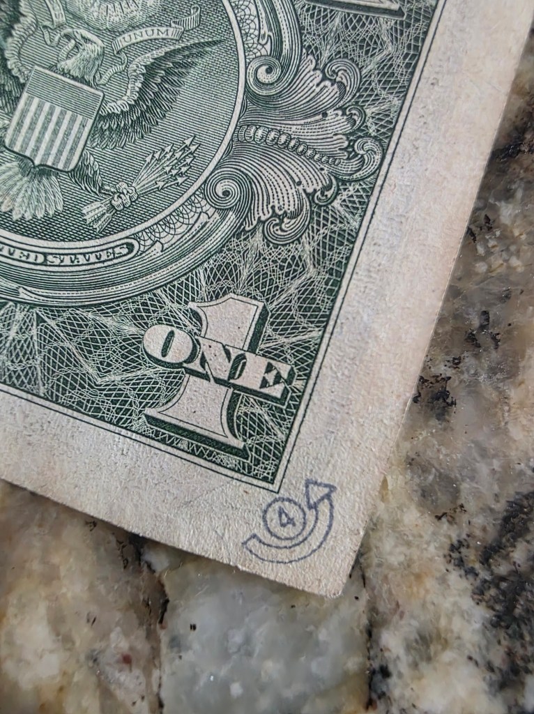 This one from Lisa is fascinating to me. It appears to be someone who is participating in Where’s George (or a similar program) and in all the years of finding marked Where’s George bills I have never seen one done this clean and professional looking.