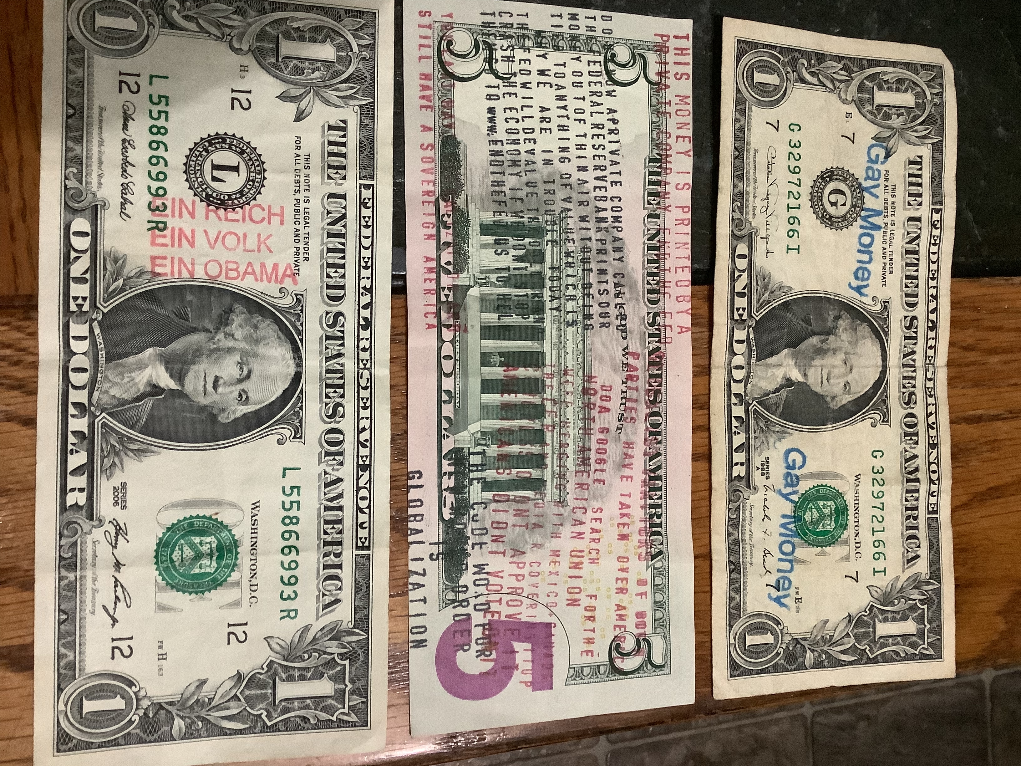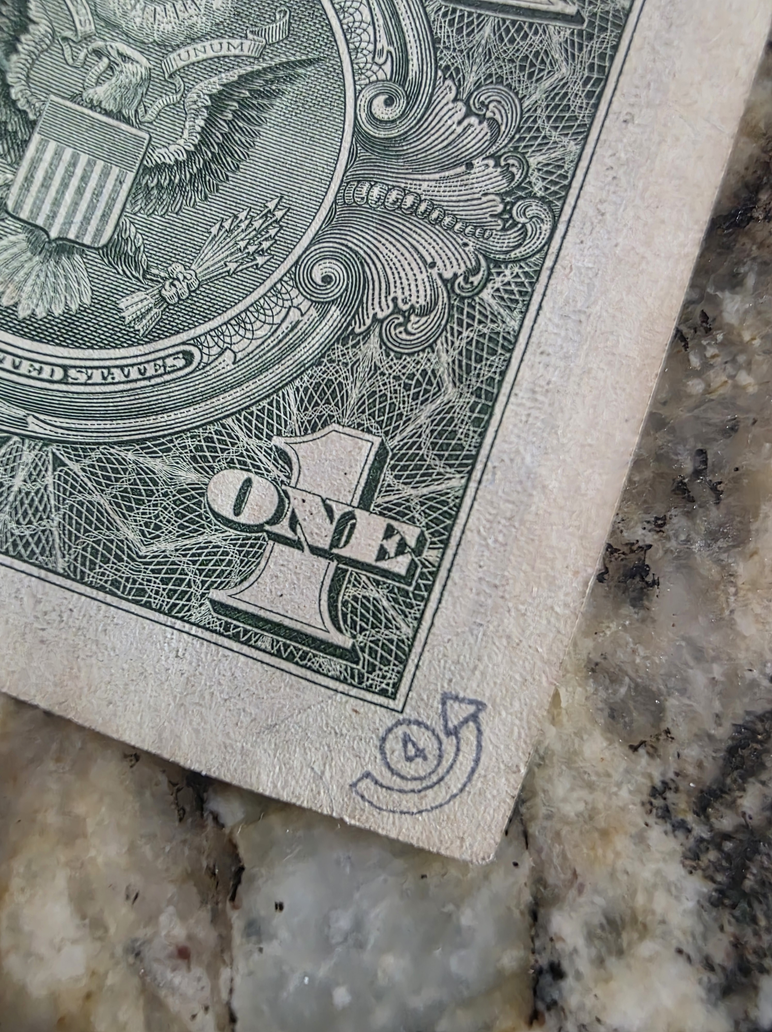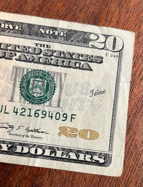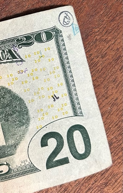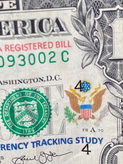 This one from Lisa is fascinating to me. It appears to be someone who is participating in Where’s George (or a similar program) and in all the years of finding marked Where’s George bills I have never seen one done this clean and professional looking.