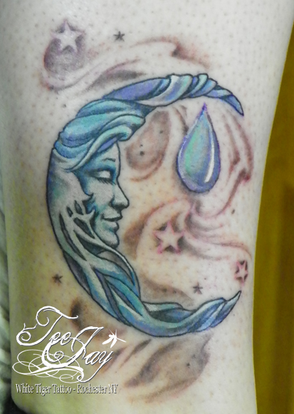 This piece fills in one of the corners left on Rachel’s back. There is a whole lot going on in this tattoo! Everything in it is specifically selected by Rachel and is as unique as she is.